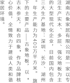 古象地板是湖南古象家居有限公司旗下的品牌,是專注于生產(chǎn)實(shí)木、多層、強(qiáng)化地板的木地板廠家,目前國(guó)內(nèi)包含三大生產(chǎn)基地:深圳、長(zhǎng)沙、湖州。年生產(chǎn)能力為400萬平方米。品牌成立多年以來,以強(qiáng)大的實(shí)力和盡善盡美的產(chǎn)品以及誠(chéng)信經(jīng)營(yíng)獲得廣大用戶和合作伙伴滿意和信任,古象地板已經(jīng)廣泛應(yīng)用于國(guó)內(nèi)各大城市的樓盤、酒店、公共區(qū)域。